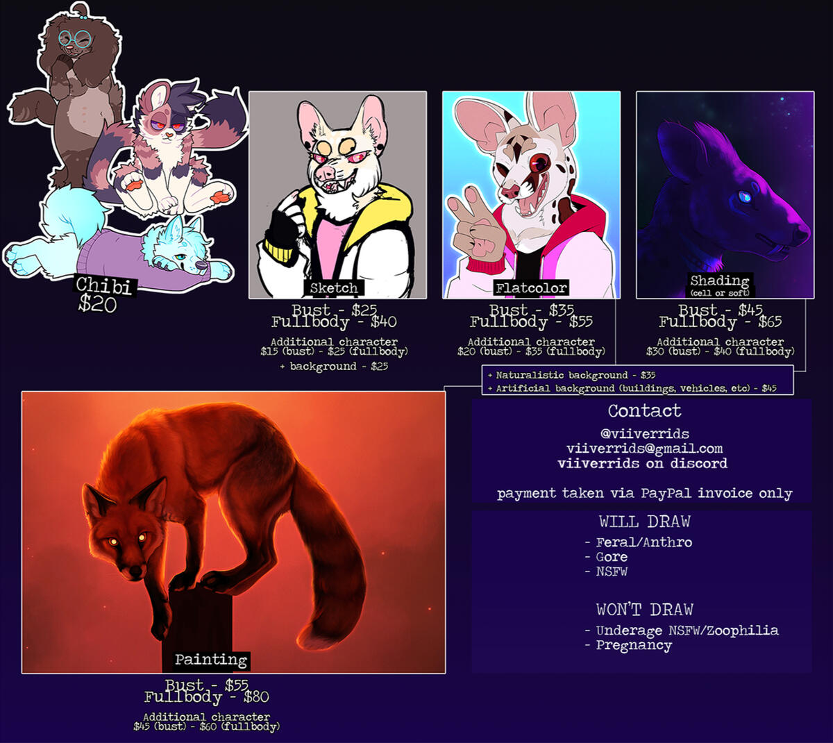 If you are interested in commissioning me please contact me via email at [email protected] or on Discord at viiverridsIn your message please include a filled out version of the following form: