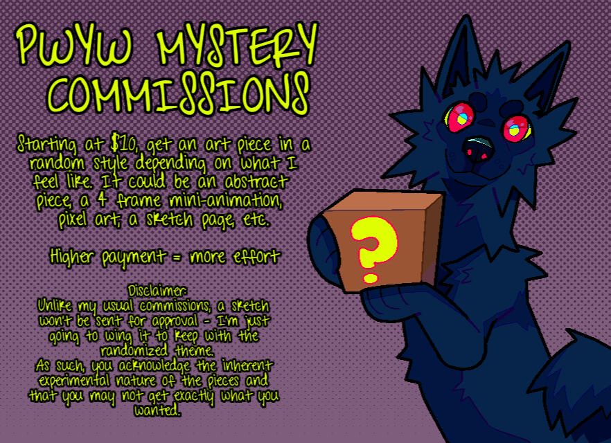 Commissions must be paid in full upfront via Paypal before I start working. Do not send payment before I accept your commission - I will send an invoice.If you would like to send a tip I take them via my Ko-Fi!
